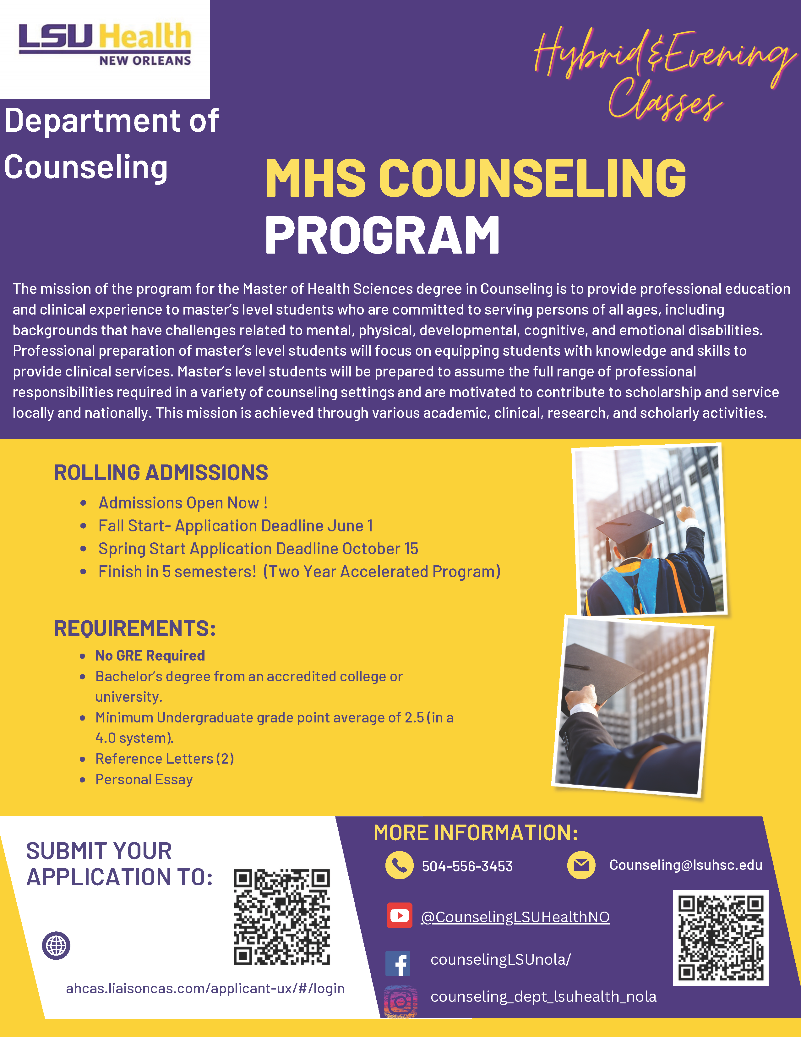 The Master of Health Sciences in Clinical Mental Health Counseling (MHS) program is fully accredited by the Council for Accreditation of Counseling and Related Educational Programs (CACREP) and is a 60-credit hour graduate program, on campus instruction classroom environment, with some courses offered with remote learning, as approved by CACREP. The program prepares counselors to assume the full range of professional responsibilities required in community counseling organizations, private as well as publicly funded and nonprofit, and to contribute to scholarship and service locally and nationally. All classes are synchronous, offered either in person on campus during the day (generally 9:00am to 4:30pm) or live via Zoom, with both daytime and evening (generally 5:00 pm to 8:00 pm) options.